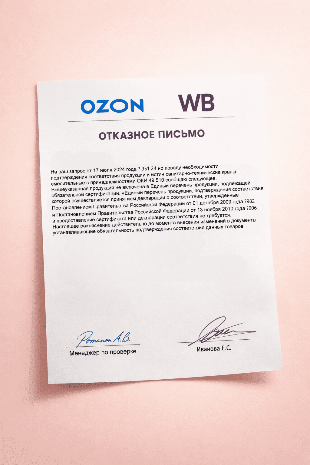 Отказное письмо — это документ, подтверждающий, что товар не подлежит обязательной сертификации или декларированию соответствия. Он даёт возможность продавать продукцию на российских маркетплейсах без сертификата и декларации о соответствии.